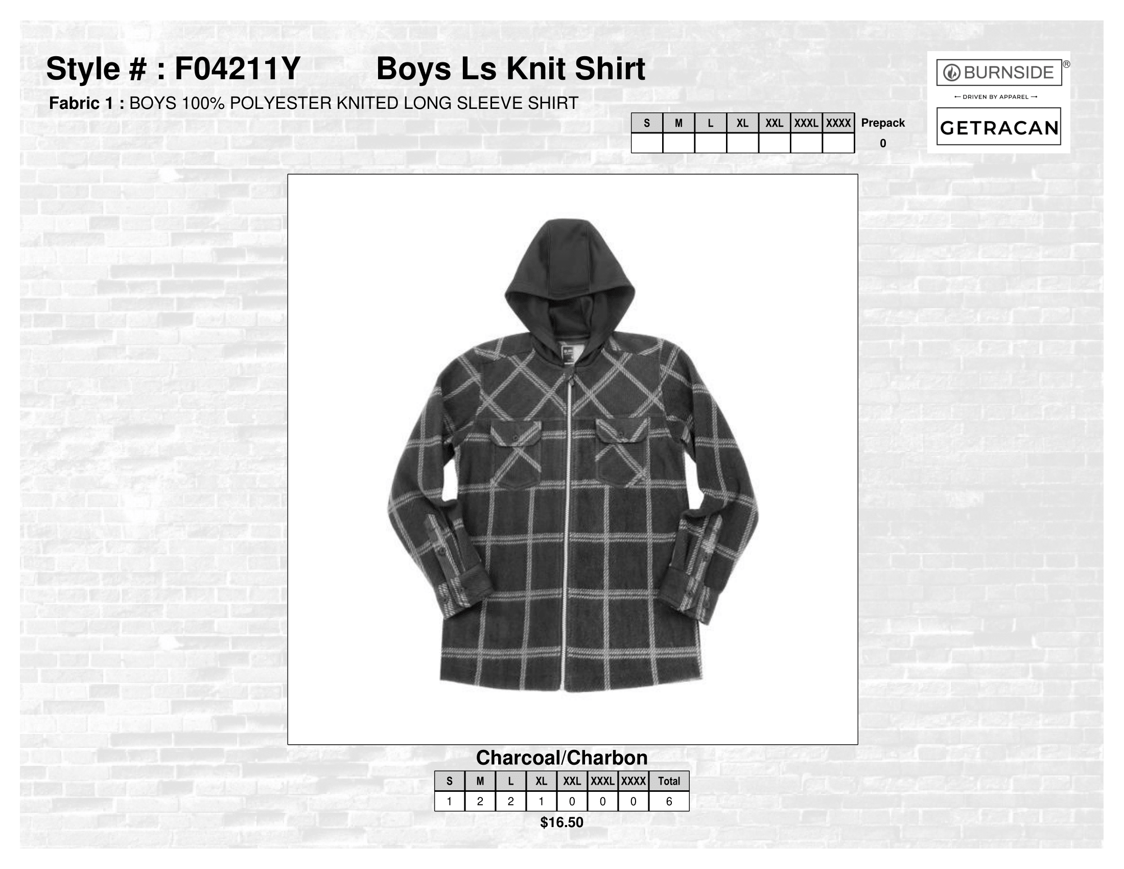 Burnside - FW2026 - Boys › F04211Y Boys Ls Knit Shirt Image 1 of 1 F04211Y Boys Ls Knit Shirt CA$99.00 Prepack of 6Fabric 1 : BOYS 100% POLYESTER Add To Cart Added! Prepack of 6Fabric 1 : BOYS 100% POLYESTER