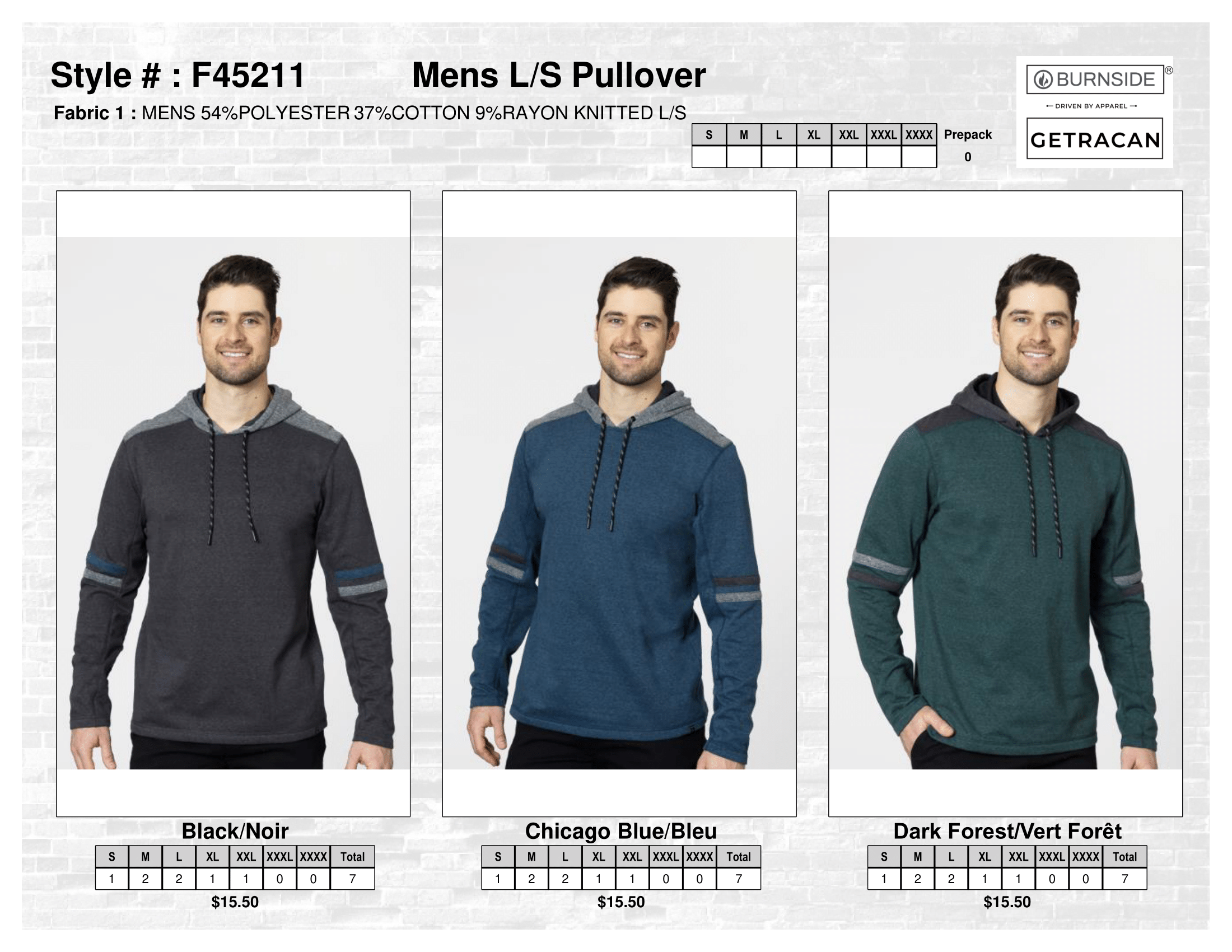 Burnside - FW2026 - Mens › F45211 Mens L/S Pullover Image 1 of 1 F45211 Mens L/S Pullover CA$108.50 Prepack of 7Fabric 1 : MENS 54%POLYESTER, 37%COTTON, 9%RAYON Color: Black Chicago Blue Dark Forest Add To Cart Added! Prepack of 7Fabric 1 : MENS 54%POLYESTER, 37%COTTON, 9%RAYON