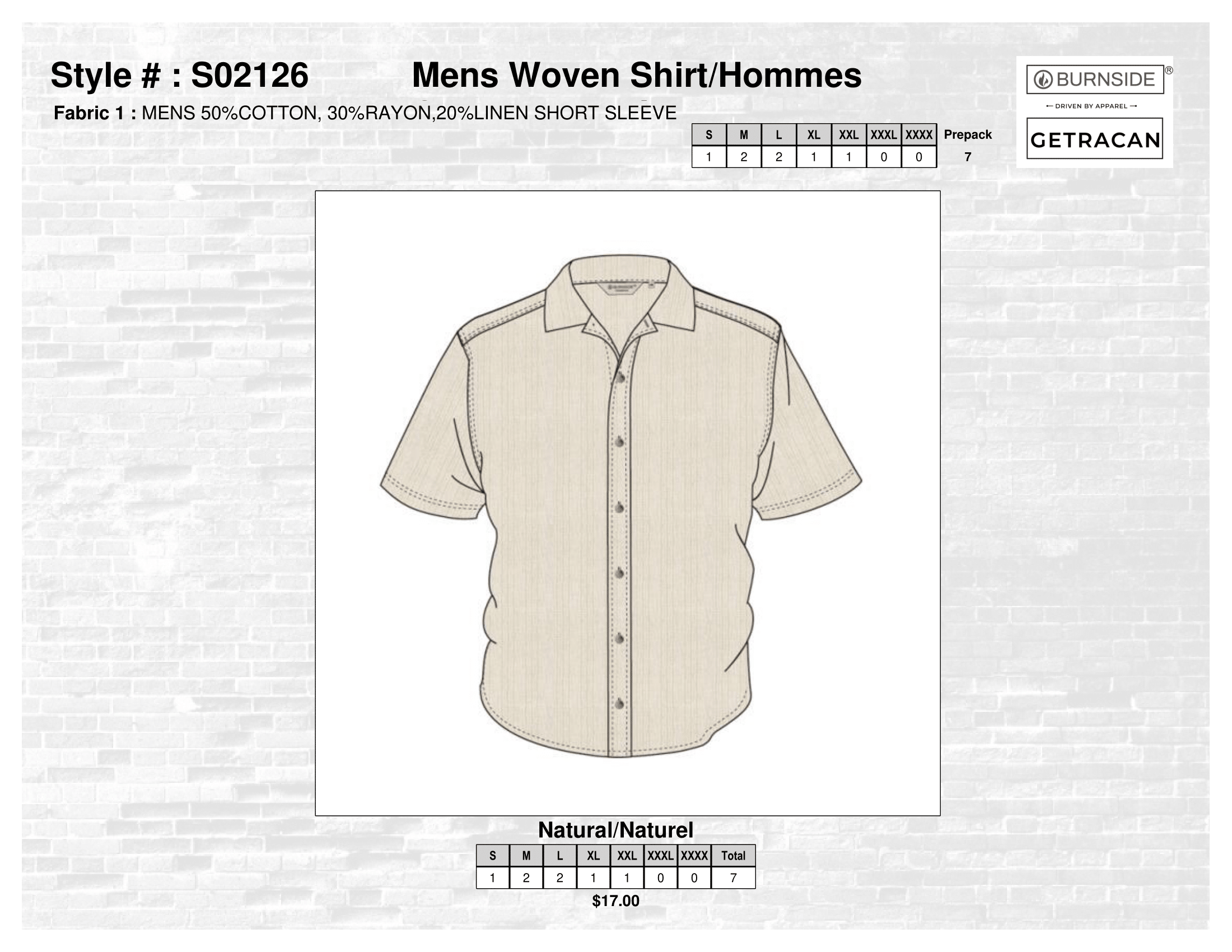 Burnside - SS2026 - Mens › S02126 Mens Woven Shirt Image 1 of 2 Image 2 of 2 S02126 Mens Woven Shirt CA$119.00 Prepack of 7Fabric 1 : MENS 50%COTTON, 30%RAYON,20%LINEN SHORT SLEEVE WOVEN SHIRT Quantity: Add To Cart Added! Prepack of 7Fabric 1 : MENS 50%COTTON, 30%RAYON,20%LINEN SHORT SLEEVE WOVEN SHIRT
