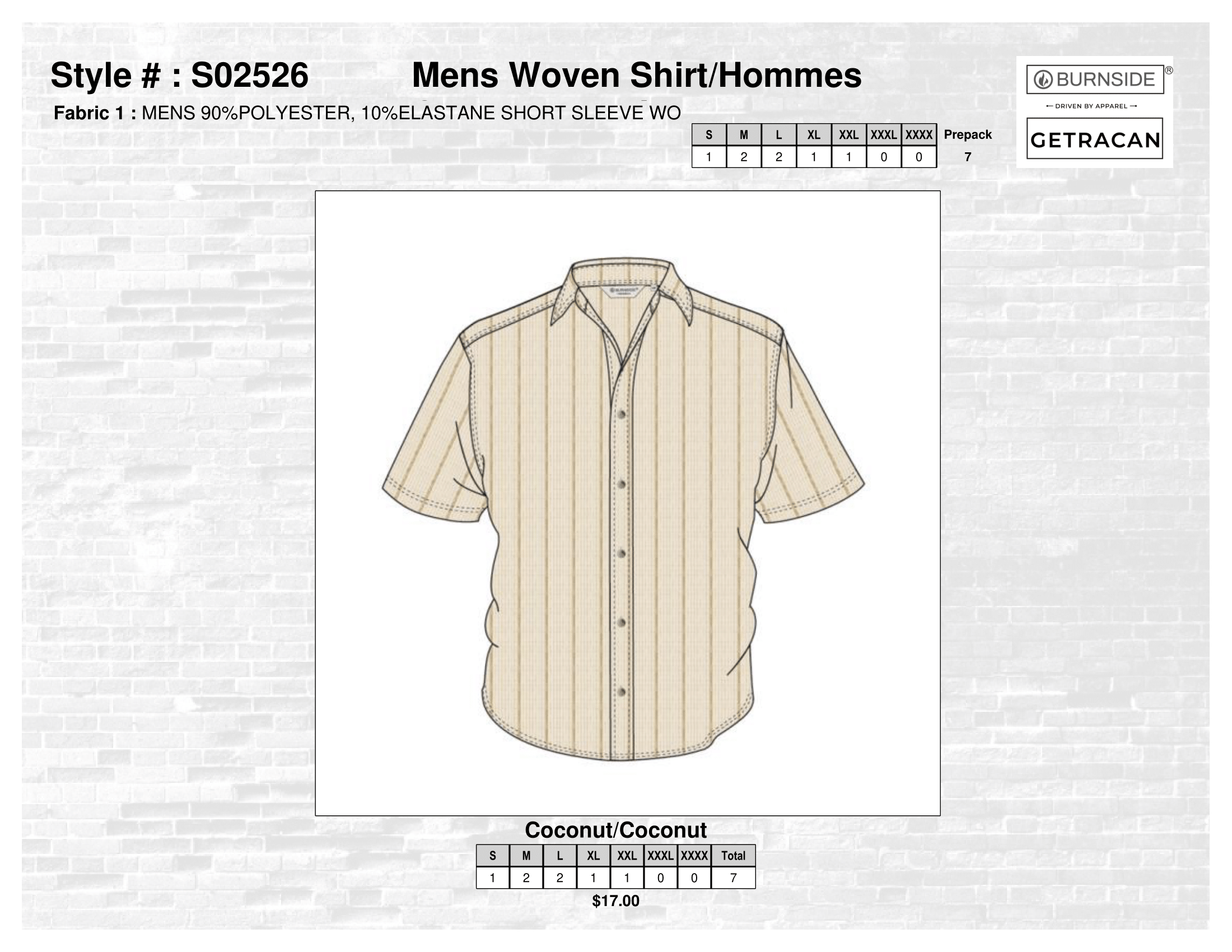Burnside - SS2026 - Mens › S02526 Mens Woven Shirt Image 1 of 2 Image 2 of 2 S02526 Mens Woven Shirt CA$119.00 Prepack of 7Fabric 1 : MENS 90%POLYESTER, 10%ELASTANE SHORT SLEEVE WOVEN SHIRT Quantity: Add To Cart Added! Prepack of 7Fabric 1 : MENS 90%POLYESTER, 10%ELASTANE SHORT SLEEVE WOVEN SHIRT