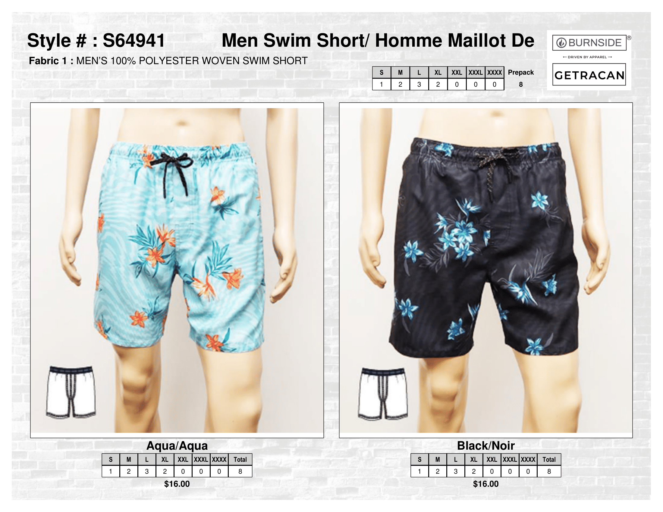 Burnside - SS2026 - Mens › S64941 Men Swim Short with Compression Lining Image 1 of 1 S64941 Men Swim Short with Compression Lining CA$128.00 Prepack of 8Fabric 1 : MENS 100% POLYESTER WOVEN SWIM SHORT Color: Aqua Black Quantity: Add To Cart Added! Prepack of 8Fabric 1 : MENS 100% POLYESTER WOVEN SWIM SHORT