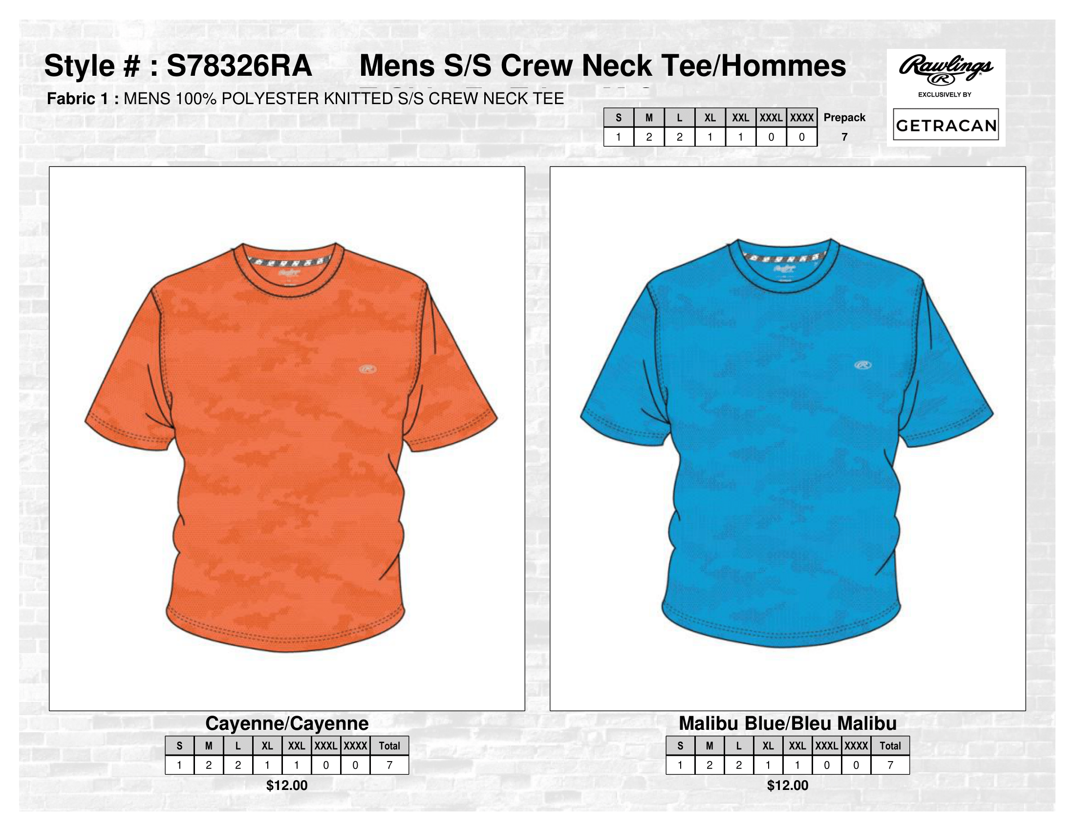 Rawling - SS2026 › S78326RA Mens S/S Crew Neck Tee Image 1 of 3 Image 2 of 3 Image 3 of 3 S78326RA Mens S/S Crew Neck Tee CA$84.00 Prepack of 7Fabric 1 : MENS 100% POLYESTER KNITTED S/S CREW NECK TEE Color: Cayenne Malibu Blue Quantity: Add To Cart Added! Prepack of 7Fabric 1 : MENS 100% POLYESTER KNITTED S/S CREW NECK TEE