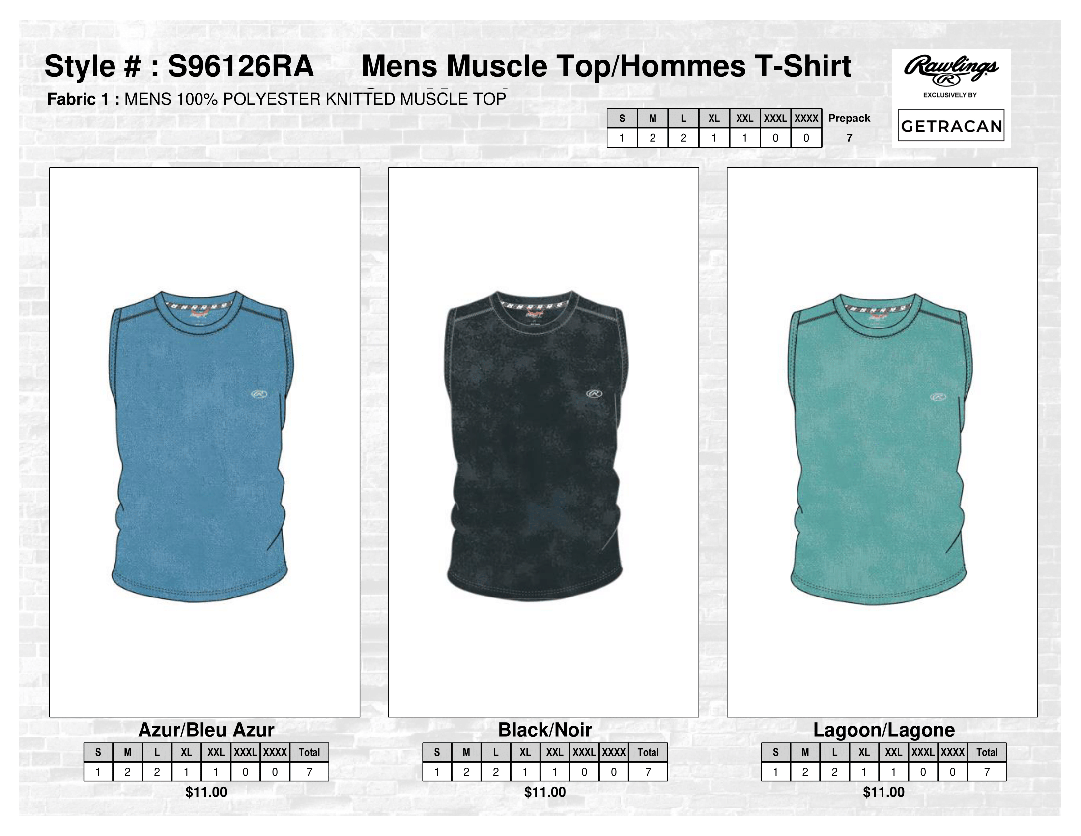 Rawling - SS2026 › S96126RA Mens Muscle Top Image 1 of 4 Image 2 of 4 Image 3 of 4 Image 4 of 4 S96126RA Mens Muscle Top CA$77.00 Prepack of 7Fabric 1 : MENS 100% POLYESTER KNITTED MUSCLE TOP Color: Azur Black Lagoon Quantity: Add To Cart Added! Prepack of 7Fabric 1 : MENS 100% POLYESTER KNITTED MUSCLE TOP