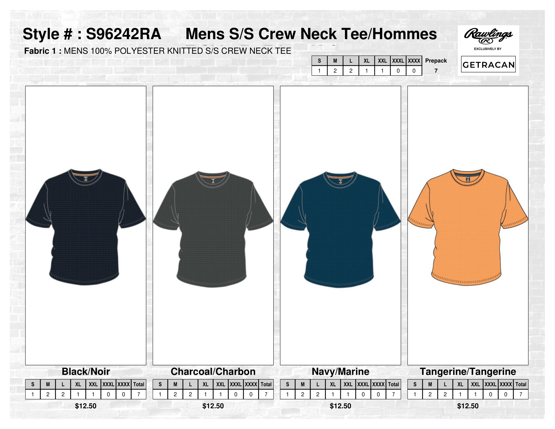Rawling - SS2026 › S96242RA Mens S/S Crew Neck Tee Image 1 of 5 Image 2 of 5 Image 3 of 5 Image 4 of 5 Image 5 of 5 S96242RA Mens S/S Crew Neck Tee CA$87.50 Prepack of 7Fabric 1 : MENS 100% POLYESTER KNITTED S/S CREW NECK TEE Color: Black Charcoal Navy Tangerine Quantity: Add To Cart Added! Prepack of 7Fabric 1 : MENS 100% POLYESTER KNITTED S/S CREW NECK TEE