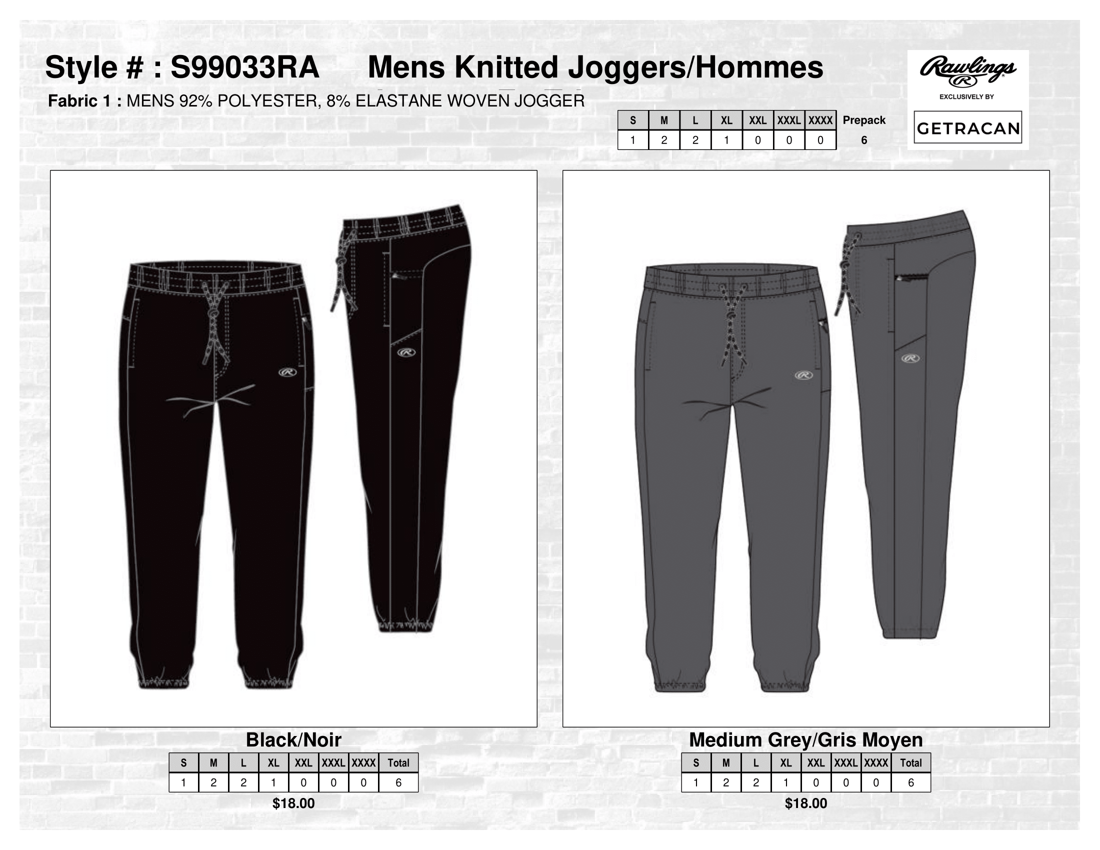 Rawling - SS2026 › S99033RA Mens Knitted Joggers Image 1 of 3 Image 2 of 3 Image 3 of 3 S99033RA Mens Knitted Joggers CA$108.00 Prepack of 6Fabric 1 : MENS 92% POLYESTER, 8% ELASTANE WOVEN JOGGER Color: Black Medium Grey Quantity: Add To Cart Added! Prepack of 6Fabric 1 : MENS 92% POLYESTER, 8% ELASTANE WOVEN JOGGER